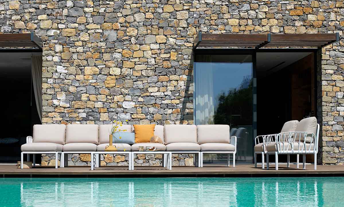Inspirado en las ramas de los árboles, la colección Komodo es un sistema modular de sofá para exterior, con estructura de resina de fibra de vidrio y acolchado, con una extraordinaria flexibilidad de composición y que se puede diseñar a placer según el espacio, los gustos y las necesidades. Como podemos ver en los detalles fotográficos podemos componer un sofá grande ó bien una rinconera y lo mejor de todo…¡en la medida que necesitemos!