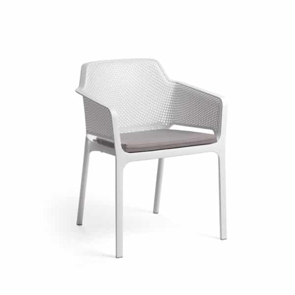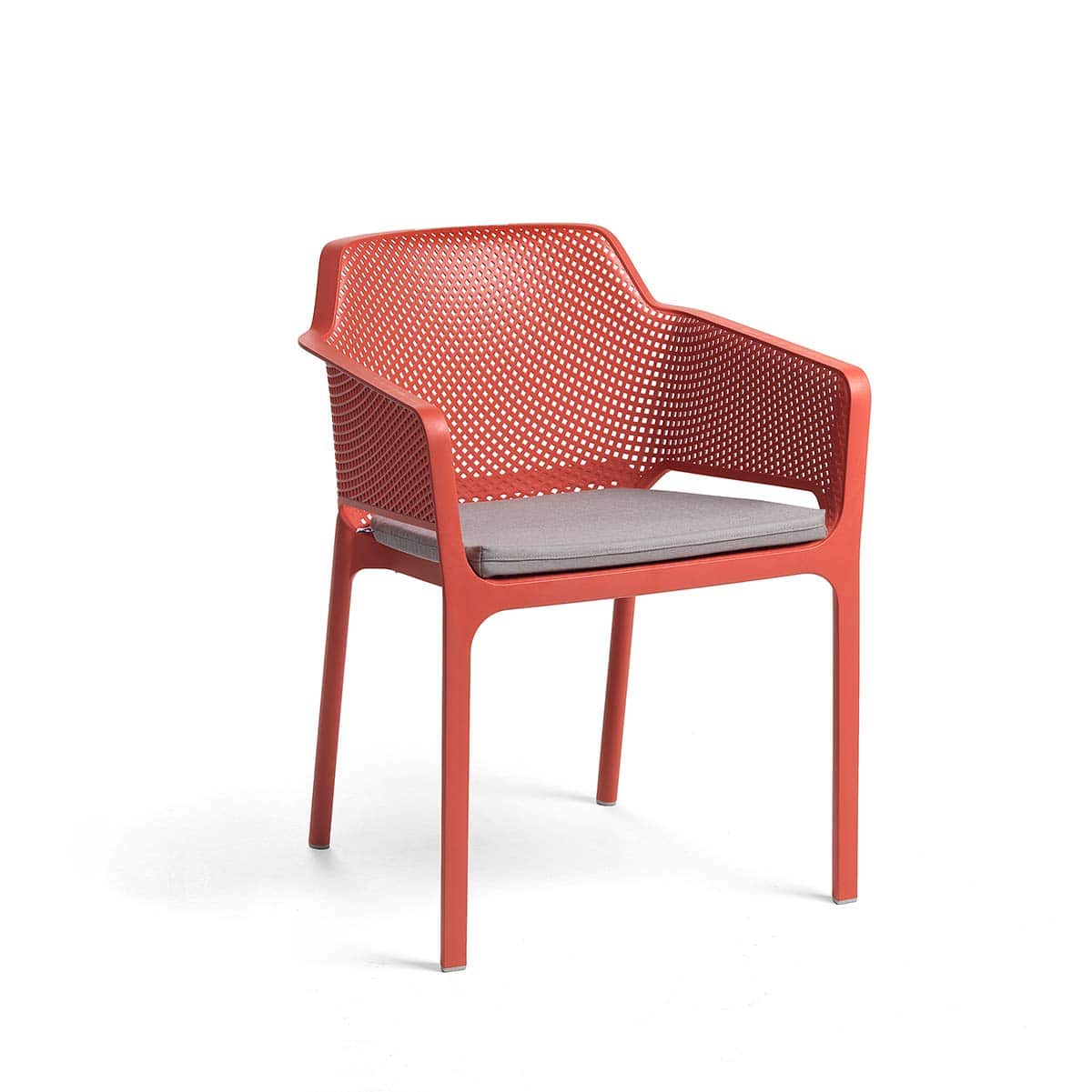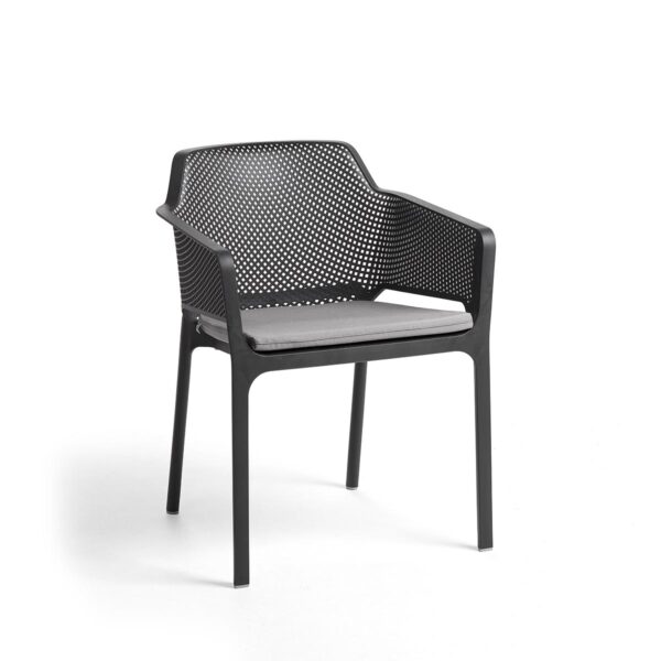 Refinado relax para este sillón Net, de una sola pieza de resina de fibra de vidrio cuidadosamente perforada con un motivo de agujeros cuadrados y rayados distribuidos con continuidad en la superficie tridimensional de la silla.