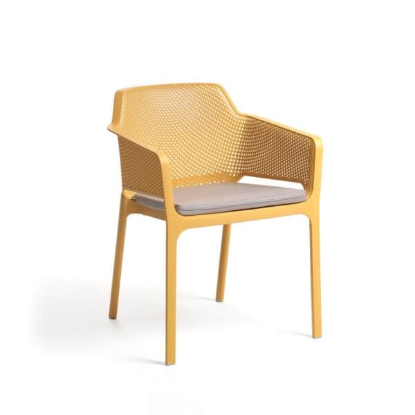 Sillón monobloc. Polipropileno fiberglass tratado anti-UV y teñido en masa. Efecto mate. Con tapones antideslizantes. Cojin opcional. Resina reciclable.
