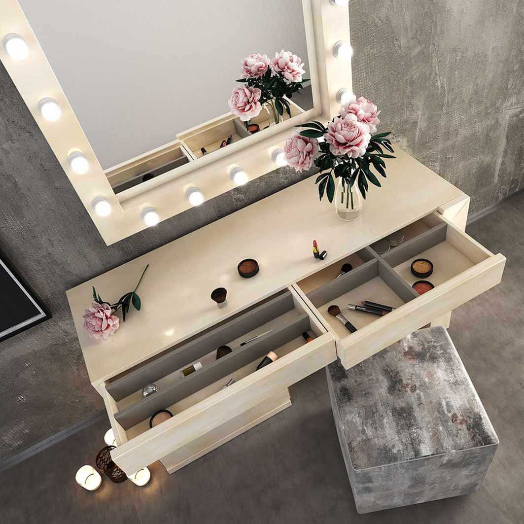 Primeras calidades y guías de extracción con frenado en cajones garantizan la durabilidad de esta pieza. En el detalle fotográfico verás el interior del cajón que lleva divisores para que almacenes tu maquillaje y pinturas a tu gusto. Se ha complementado con un pouff en gris.