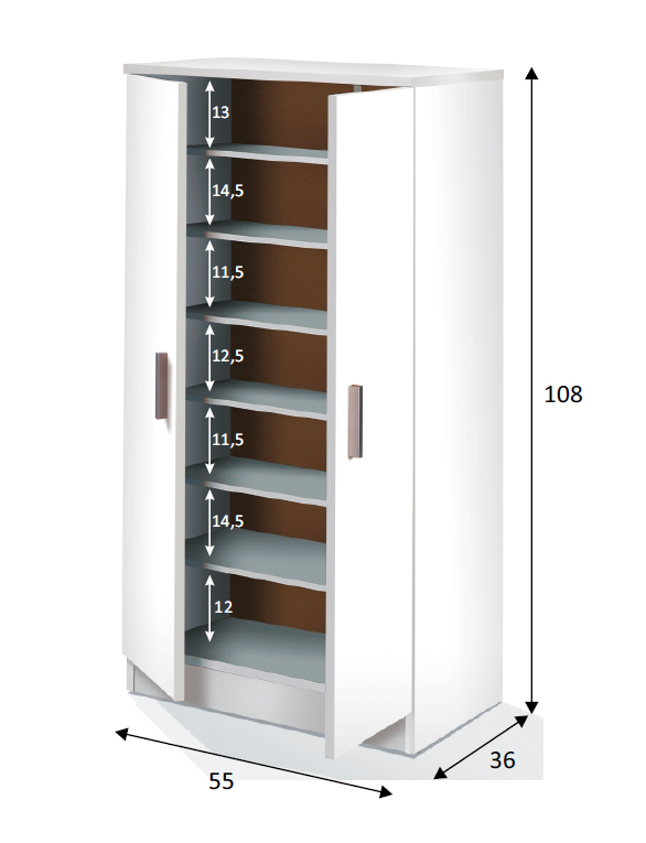 Este modelo de 2 puertas lo podrás encajar en un baño, en la galería y si no tienes espacio en otro sitio de tu casa lo podrás colocar en el dormitorio acompañándolo con una decoración bonita. Consta de 6 estantes interiores que van sueltos con posibilidad de extracción para hacer los huecos más grandes, según si tienes que colocar zapatos o botas, con todos los estantes colocados se quedan siete huecos para aprovecharlos al máximo.