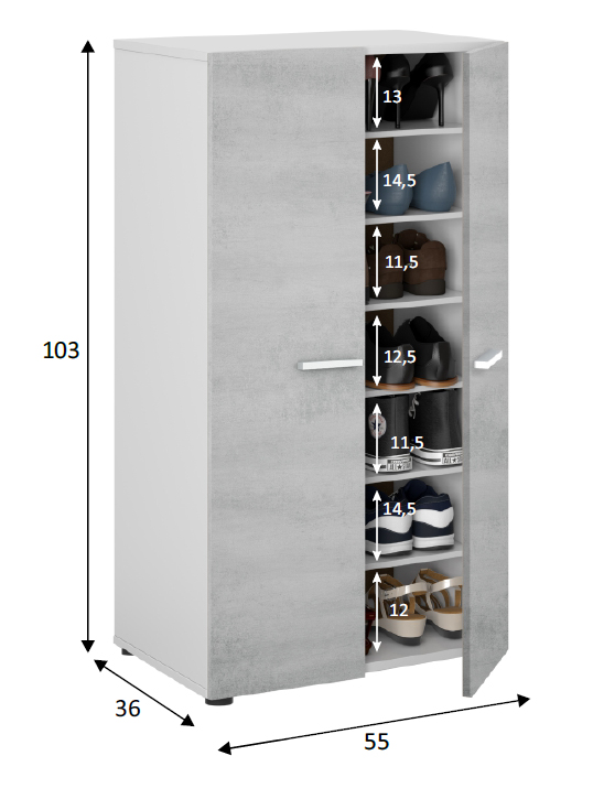 Este modelo de 2 puertas lo podrás encajar en un baño, en la galería y si no tienes espacio en otro sitio de tu casa lo podrás colocar en el dormitorio acompañándolo con una decoración bonita. Consta de 6 estantes interiores que van sueltos con posibilidad de extracción para hacer los huecos más grandes, según si tienes que colocar zapatos o botas, con todos los estantes colocados se quedan siete huecos para aprovecharlos al máximo.